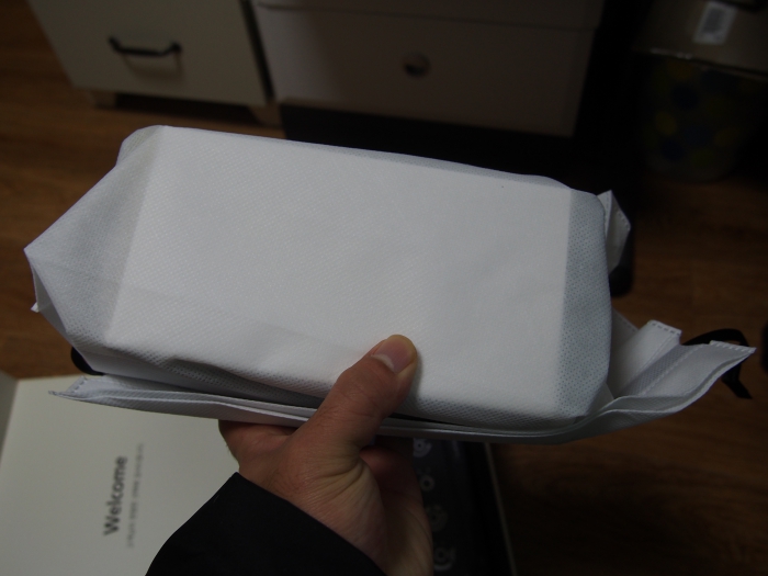 자 이제 포코폰을 만나볼 시간입니다. 웰컴북을 들어올리면 고급스러운 주머니 속에 포코폰 상자가 들어있습니다.