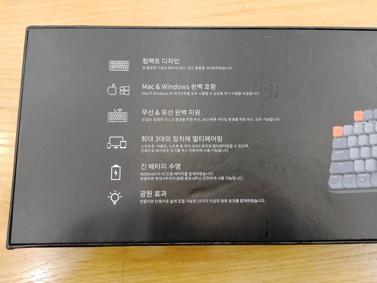박스 뒷면에는 키크론 K6 제품의 주요 특징이 나와있다. 무선 키보드에서 필요한 기능은 모두된다고 보면 된다. 게다가 컴팩트하기까지.