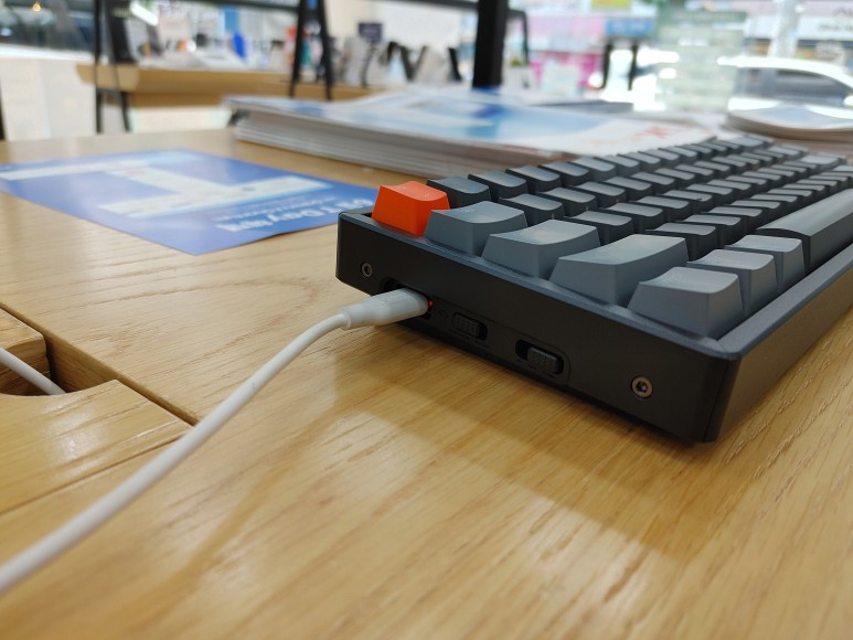측면부에는 C타입 충전단자와 운영체제 토글버튼, 블루투스-유선 전환버튼이 자리잡고 있다. 이 제품은 윈도우와 맥, 안드로이드, ios를 모두 지원하며 여분의 키캡을 통해 운영체제에 맞는 키로 교체할 수 있게 되어있다.