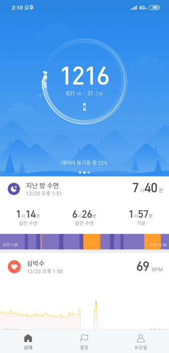 미밴드에서 측정한 걸음수나 수면시간, 심박수는 스마트폰의 Mi Fit 앱을 통해 확인할 수 있습니다. 단순한 수치 이외에도 데이터 분석을 통해 간단한 피드백도 제공해줍니다.