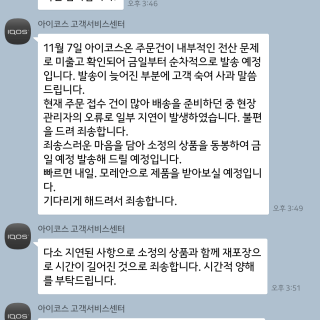 내부적 전산 문제로 배송이 누락되었고, 소정의 상품을 동봉해 당일 발송하겠다는 메시지를 받았습니다. 이미 배송이 늦어지고, 저보다 늦게 주문한 분들은 이미 아이코스 사용자 모임에 인증샷을 올리고 있었습니다만…