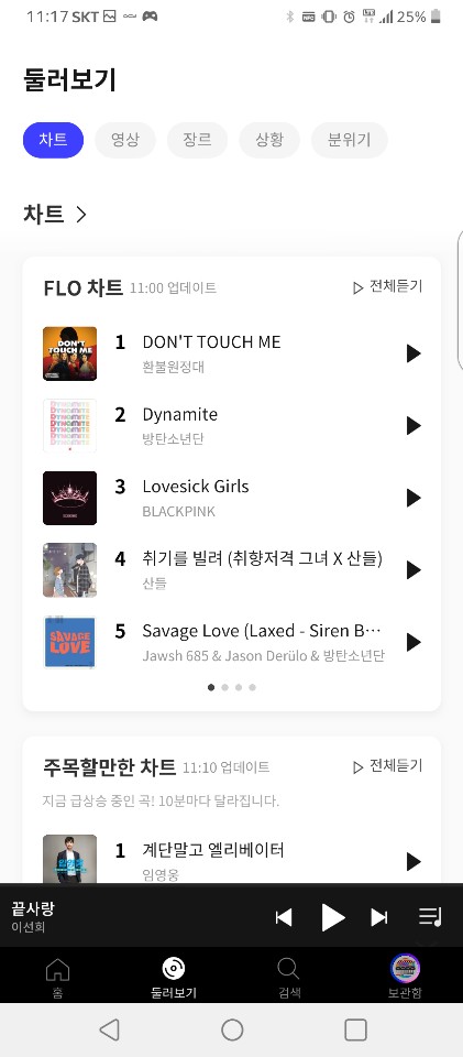 그렇다고 해서 FLO에 실시간 차트가 없는 것은 아닙니다. 두번째 둘러보기 항목을 들어가보면 실시간 차트를 확인할 수 있는데요 실시간 차트 이외에도 장르별로 세분화된 차트가 준비되어 있습니다.