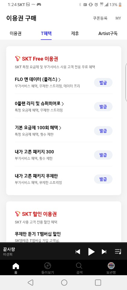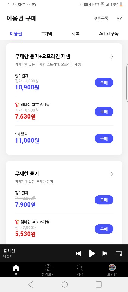통신사에서 운영하는 음원앱인만큼 할인혜택은 다양한 편입니다. SK텔레콤 고객의 경우 스트리밍 요금제는 T멤버십 할인 이용시 7,630원이지만 이 경우에는 7,900원에 운영하는 'FLO 앤 데이터'에 가입하시는 것이 좋습니다. 2개월(가입 후 익월까지) 100원에 이용가능하고 무제한 듣기는 물론 전용 데이터까지 제공하고 있기 때문입니다.