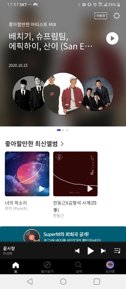 스포티파이처럼 사용자의 취향에 맞추어 사용자가 좋아할만한 음원을 추천해주는 기능을 전면에 내세우고 있습니다. 여타 국내 음원 서비스의 경우에는 실시간 차트가 메인인 것과는 대조됩니다.