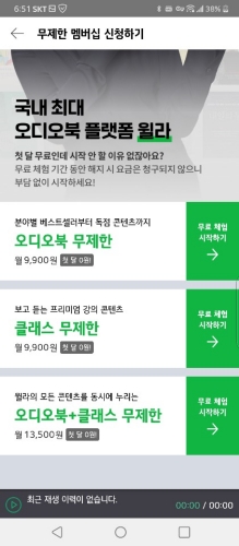 윌라는 오디오북을 단품으로 판매하기도 하지만 월정액 서비스에 더 높은 비중을 두고 있습니다. 클래스 1개를 구입하는 것보다 무제한 월정액에 가입하는 것이 더 저렴합니다. 무료 오디오북도 있으니 이용권 구매 전 한번 들어보시는 것도 좋을 것 같아요