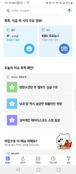 최근에는 투데이 기능도 업데이트가 되어서 SK텔레콤의 인공지능 서비스인 누구(NUGU)와 연계한 개인화 정보 시스템을 제공하고 있습니다. 대부분은 SK텔레콤과 연관된 서비스가 주로 노출되고 있습니다.