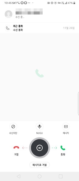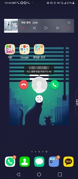 휴대폰을 사용하지 않을 때 전화가 걸려오면 전체화면으로 전화 수신을 알려주는데 스마트폰을 사용 중일 때 전화가 걸려오면 작은 수신화면을 팝업 형식으로 제공하고 있습니다.