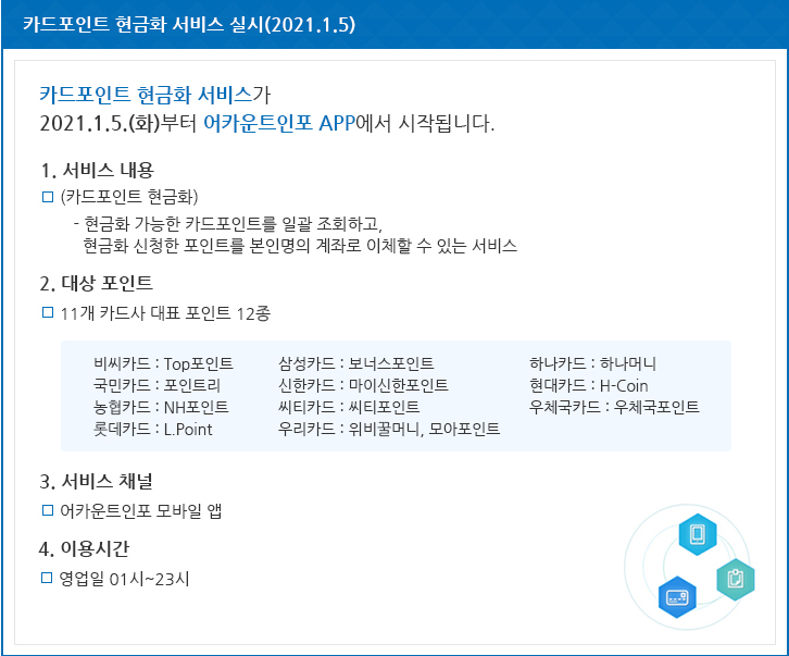 1월 5일부터 잠자고 있는 카드 포인트를 손쉽게 현금화시킬 수 있는 방법이 나왔는데요. 여러 금융기관의 정보를 모아서 볼 수 있는 어카운트 인포라는 서비스가 있는데 여기서 카드포인트 현금화를 지원합니다.