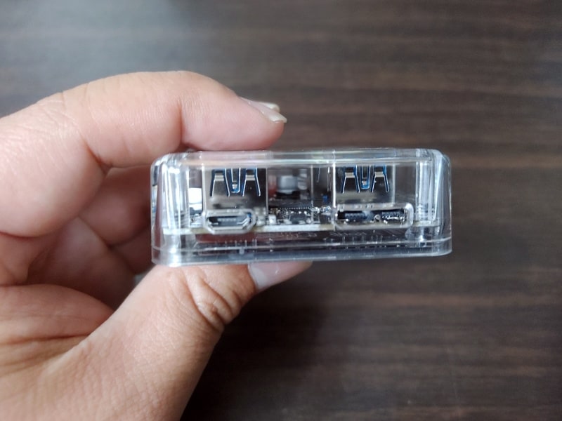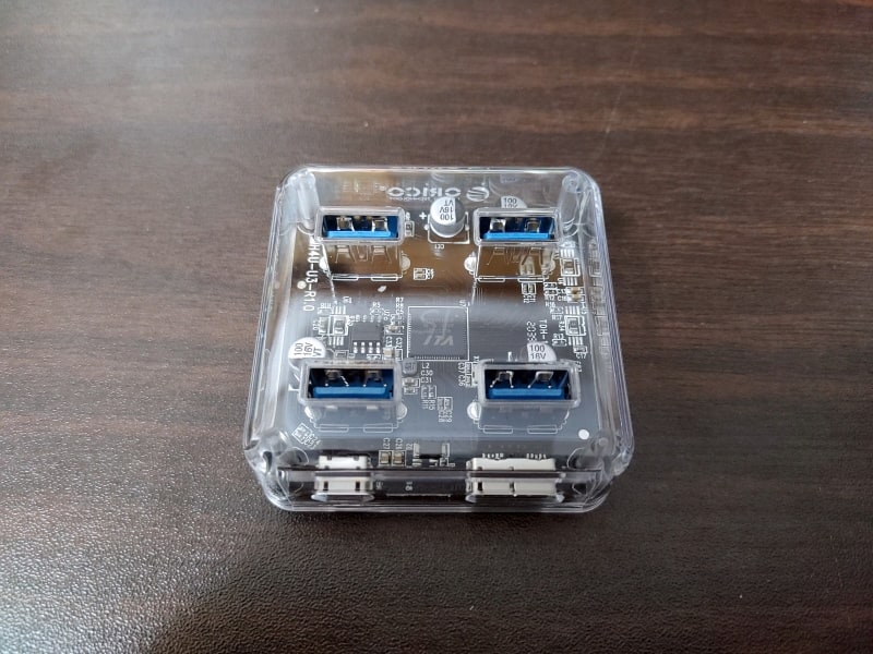 이 제품의 가장 큰 특징은 투명한 디자인입니다. 내부 기판이 훤히 보이는 투명 플라스틱을 적용해서 공대 감성을 자극합니다. 저도 투명한 디자인이 끌려서 구매하게 되었습니다. 상단부에는 USB 3.0 포트 4개가 위치해있고 후면에는 데이터 송신 단자와 전원 공급을 위한 5핀 단자가 위치하고 있습니다.