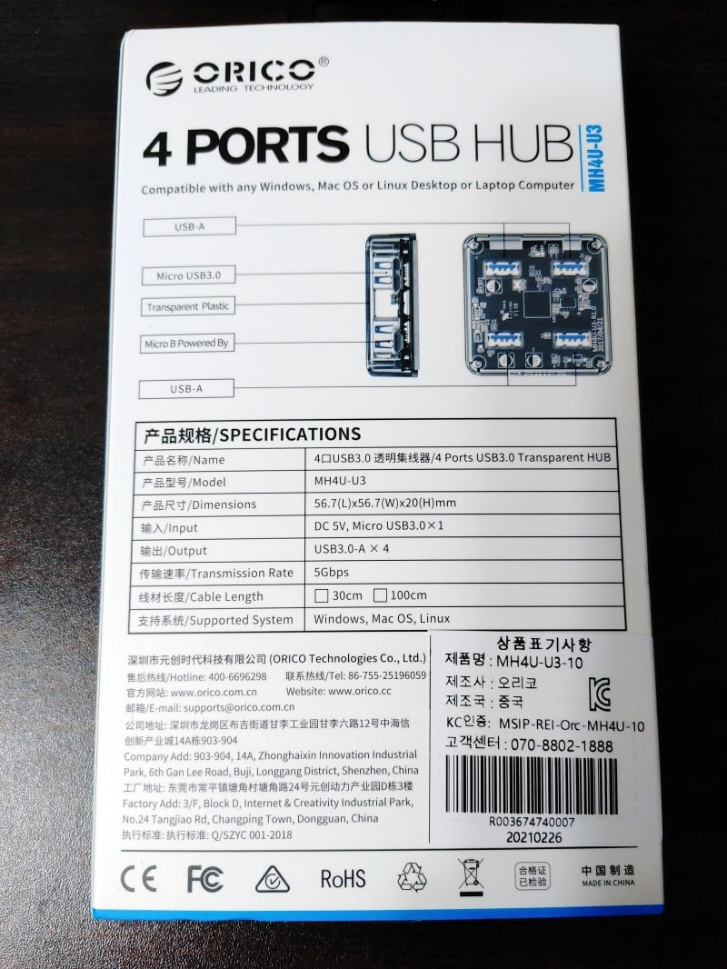 오리코는 중국의 PC용 주변기기 제조업체입니다. 국산 제품이 아니긴 하지만 상당수의 USB 허브가 중국에서 생산되고 있기 때문에 큰 거부감은 없었습니다. 또한 1만원 정도의 저렴한 가격에 구입이 가능하기 때문에 저처럼 가성비를 중요하게 생각하는 분들은 좋은 선택이 될 듯합니다.