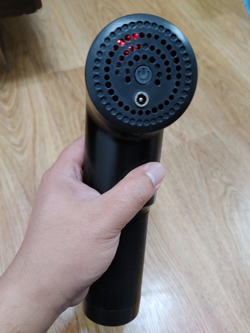 마사지 건 본체입니다. 크기는 손에 쥐는데 무리 없는 수준이지만 배터리 때문인지는 몰라도 무게가 1KG입니다. 사용자에 따라서는 장시간 들고 사용할 경우 약간 무겁게 느껴질 수도 있습니다.
