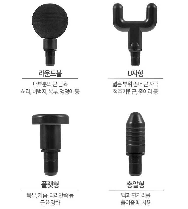 박스를 개봉하면 마사지 건 본체와 함께 사용설명서, 충전기, 4종류의 마사지 헤드가 동봉되어 있습니다. 색상은 검은색 단일 색상으로 판매하고 있습니다.
