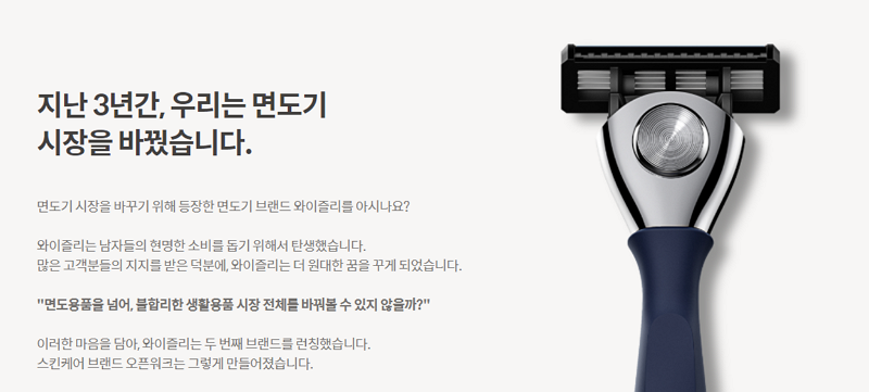 사실 이 제품은 와이즐리라는 회사에서 만들었습니다. 와이즐리는 합리적인 가격에 면도날을 정기배송해주는 서비스를 제공하고 있습니다. 와이즐리로 개편되기 이전에는 스퀘어 쉐이브라는 브랜드로 면도날 구독 서비스를 제공했었는데요 이때 호기심에 한번 신청했다가 지금까지 만족하면서 사용하고 있는 중이라 오픈워크도 기대가 많이 됐습니다.