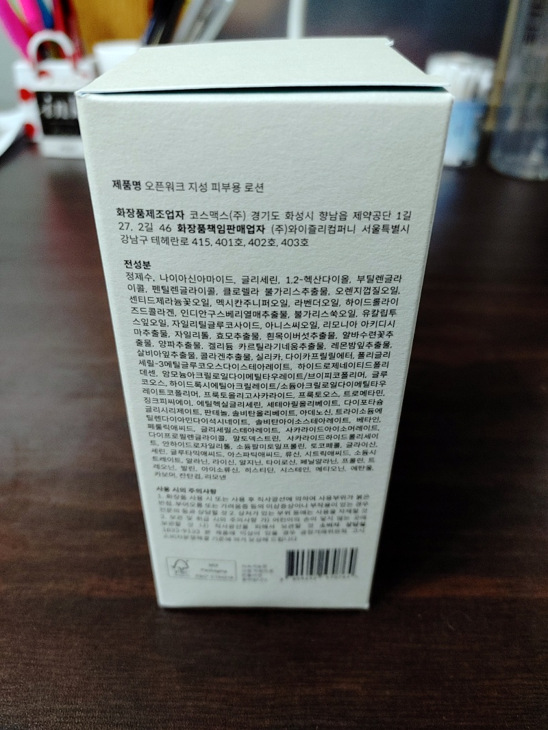 제품 성분이 표시되어 있는 부분을 촬영했습니다. 지성용 로션은 징크피씨에이라는 피지선 자극을 방지해주는 물질을 첨가했다고 합니다. 제품 생산은 화장품 ODM 생산을 주력으로 하는 코스맥스라는 업체에서 담당하고 있습니다.