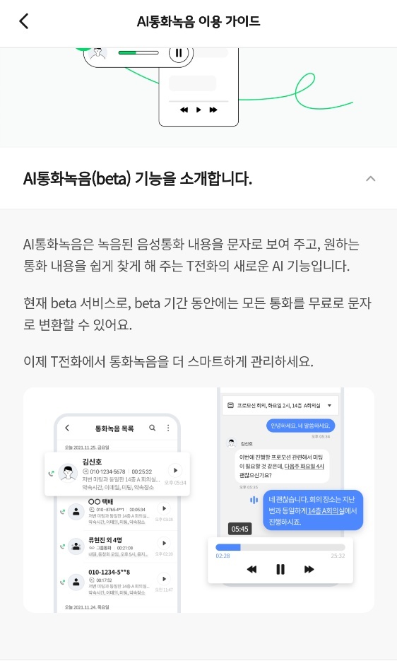 오늘 소개해드릴 AI 통화녹음은 녹음파일을 TTS(Text to Speech) 기술을 통해 자동으로 텍스트로 변환해주는 기능입니다. SK텔레콤의 AI 기술을 접목시켜 이전보다 정확한 음성 변환 기능을 제공한다고 하는데 간단하게 살펴보도록 하겠습니다.