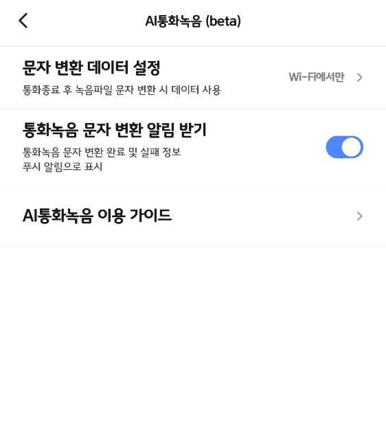 AI 통화녹음 메뉴에서는 문자 변환 기능을 셀룰러 데이터로 사용할지 여부를 선택할 수 있습니다. 이 기능이 휴대폰 내부에서 실행되는 것이 아니라 SK텔레콤 서버를 통해 제공되기 때문에 데이터 사용이 필수적인데요. 만약 급하게 필요한 내용이 아니라면 통화 종료 후 Wi-Fi 연결 시 자동으로 변환해서 알려주기 때문에 사용 중인 요금제의 데이터가 넉넉하지 않다면 Wi-Fi에서만 실행되도록 설정하시는 것을 추천해드립니다.