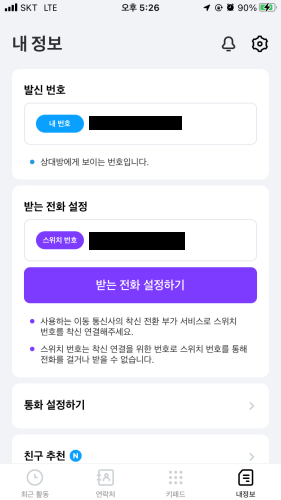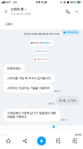 착신 전화의 경우 무료 요금제로도 무제한으로 사용할 수 있지만 스위치에서 부여하는 070 번호로 착신전환을 걸어놔야 정상적으로 음성녹음이 가능합니다. 착신전환을 활용해 스위치 서버로 통화를 우회시켜서 녹음하는 방식인데 이를 통해 OS 상에서 불가능했던 음성녹음을 아이폰에서도 구현할 수 있었지만 통신사의 유료 착신전환 서비스를 사용해야하고 통화 음질이 상당히 나빠집니다. 3G 시절의 통화 음질과 비슷한 품질이라고 보실 수 있을 것 같습니다.