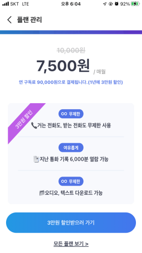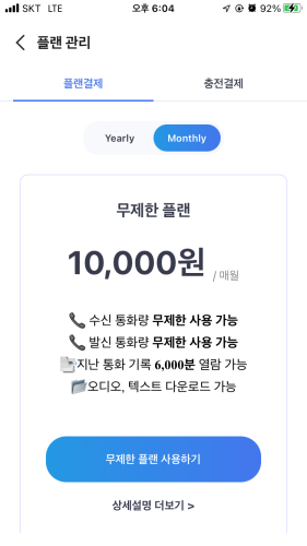 무제한 플랜은 연간 결제 시 90,000원(월 7,500원 상당), 월간 결제 시 월 10,000원에 이용하실 수 있습니다. 하지만 수신전화 녹음을 위해 별도로 착신전환 서비스에 가입하게 되면 월 800원 정도의 요금이 추가됩니다.