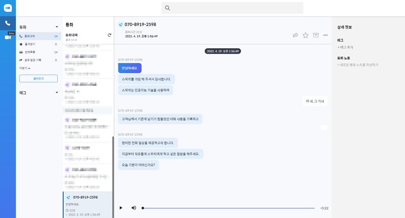 스위치는 모바일 뿐만 아니라 PC 웹사이트를 통해서도 녹음파일을 확인하고 정리할 수 있습니다. 업무용 전화를 사용하시는 분들은 편리하게 통화 내용을 확인할 수 있습니다.