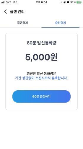 통화량이 많지 않은 편이라면 발신통화 60분만 5,000원에 결제해서 사용할 수도 있습니다. 하지만 무제한 플랜에 비해 가성비가 많이 떨어지는 편이기 때문에 무료 플랜을 아껴서 사용하거나, 무제한 플랜을 사용하시는 것이 보다 합리적이라고 생각됩니다. 일단 수신전화는 무제한 무료이고 발신전화는 필요할 때만 사용하면 되니까요. 다만 앞서 말씀드린 것처럼 상당히 불편한게 단점입니다.