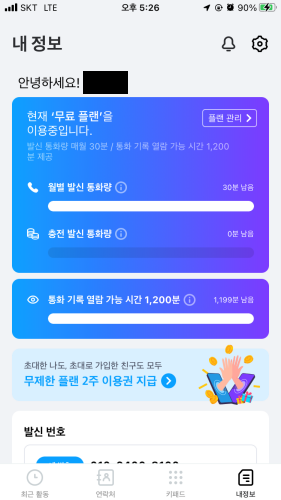 내 정보 항목에서는 잔여 발신 통화량과 통화 기록 열람 가능시간을 확인할 수 있습니다. 무료 요금제의 경우에는 30분의 발신통화와 1200분의 열람 시간이 제공되고 월 1만원의 요금을 지불하면 스위치의 모든 기능을 무제한으로 활용할 수 있습니다.